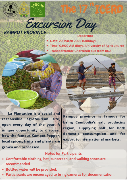 The 17th ICERD Organizing Committee is offering complimentary programs specially tailored to provide overseas registered participants with various experiences of Kampot province and its vicinity, from nature and culture to other attractions.